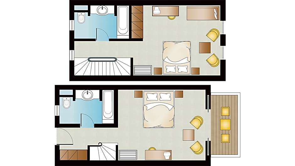 The comfortable and spacious accommodations has a combined bedroom and sitting area. The bedroom is equipped with a four-poster bed and is separated from the sitting room by a sliding door.