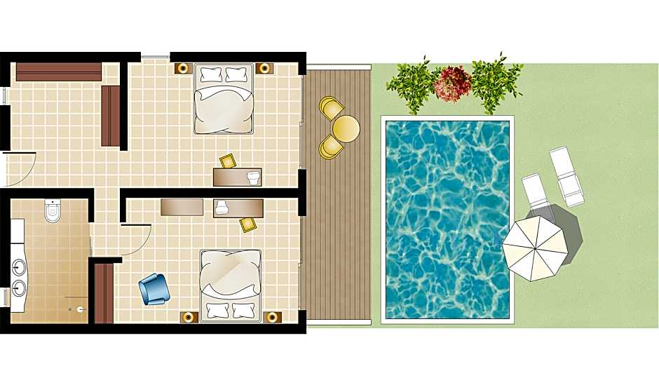 The air-conditioned bungalow features 1 bedroom and 1 bathroom with a bath and a hairdryer. This bungalow has soundproof walls, flat-screen TV with satellite channels, pool views, as well as wine/champagne for guests. The unit offers 1 bed.
